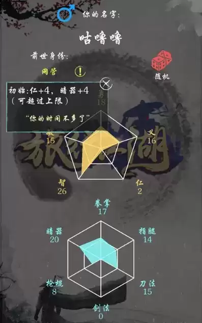 选好开局属性进游戏,先开拓功能。要一个一个点开,一个一个功能展示说明才会开下一个,然后会有快速旅行,就能进入江湖了。开局会送内功/轻功,奇遇到乞丐,选九阳便是得内功,选九阴便是得轻功,让后去商会再购买另外一个即可。