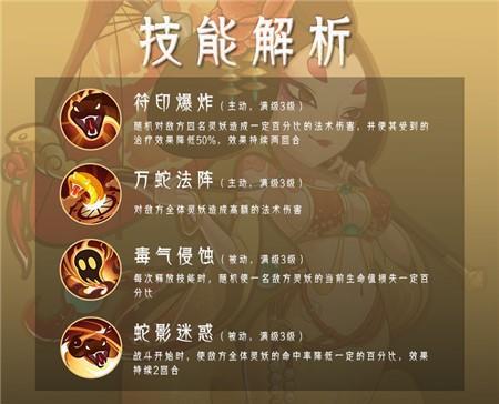 腾蛇的两个主动技能都是范围伤害技能,她的一技能【符印爆炸】可以对四名随机的敌方灵妖造成一定百分比的法术伤害,并且可以将目标受到的治疗效果降低50%;二技能【万蛇法阵】则是对敌方全体灵妖造成高额的法术伤害。
