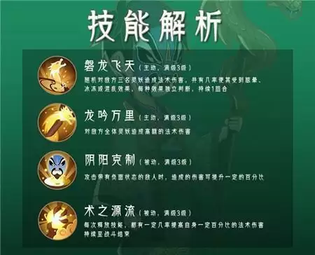 被动技能【阴阳克制】在攻击带有负面效果的敌方灵妖时,有一定的伤害加成,【术之源流】则是在伏羲每一次释放技能之后,都会有一定几率提升自身的法术伤害,并且改加成会持续战斗结束。