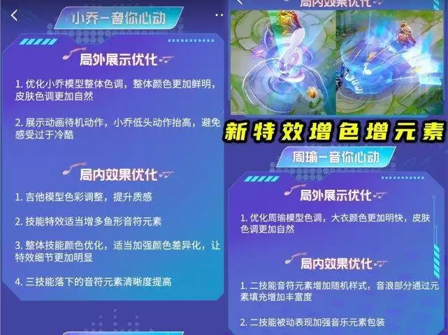 小乔音你心动,首先会对建模色调进行优化,提高颜色鲜明度,让她看起来变得更自然,其次就是局内特效,本次优化不仅会提高技能特效的清晰度,以及各种特效的渲染,还会额外新增加很多特效元素。