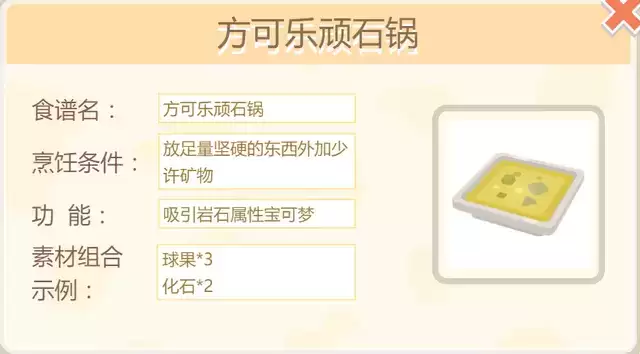 方可乐顽石锅食谱制作方法为:3个球果以及2个化石,玩家在制作的时候把素材换成2个黯黑石、2个耀金果、1个刺刺莓,制作出极致美味的方可乐顽石锅来招募到隆隆岩。