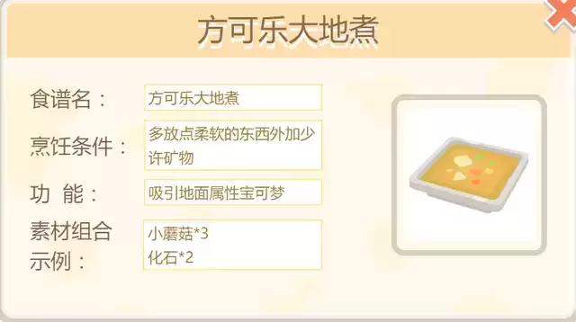 方可乐大地煮食谱制作方法是3个小蘑菇以及2个化石,而想要提升招募到隆隆岩的概率,可以把方可乐大地煮的品质提升到极致美味,方可乐大地煮极致美味的制作方法为,2个幽光蘑菇、1个芳香蘑菇以及2个黯黑石,这样就可以大大的提升隆隆岩招募到的概率。