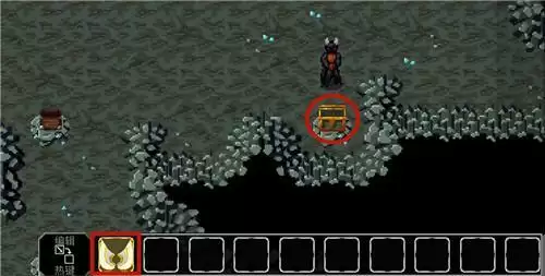 洞穴中会随机刷新如图所示的宝箱,开启后有概率获得“逃脱之翼”。(PS:还有可能获得小生命药水、小魔法药水和魔法镐,作用分别是回血、回蓝、挖属性水晶)
