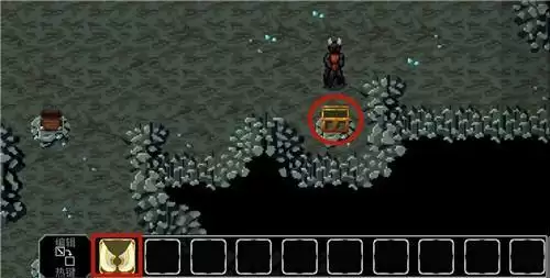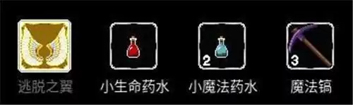洞穴中会在随机层数随机位置,刷新下图所示的宝箱,开启后会概率获得【逃脱之翼】。(PS:还有可能获得小生命药水、小魔法药水和魔法镐,分别是回血、回蓝和挖属性水晶用的。)