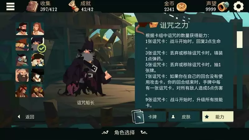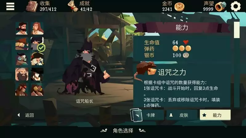 诅咒船长血量64,弹药3,是目前血量最高,初始牌组强力。诅咒船长的强度在于不断的叠加诅咒,盾和初始技能伤害也会叠加。在竞技场,建议有9个诅咒牌触发最高被动就行。诅咒船长清场能力是目前全部英雄独树一帜的。