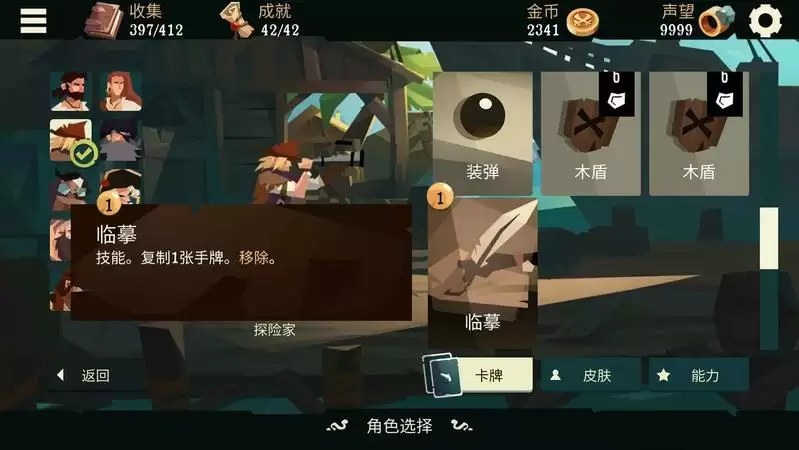 探险家血量50,弹药3,有很不错的初始牌组。探险家的强度在于抽牌选项多,可以多一个遗物栏。如果再有个眼球遗物,抽卡选项就会有五个,大大增加抽到想要卡牌的几率,事实也正是如此。并且有一张临摹卡,也可以帮助探险家前期满血过渡。