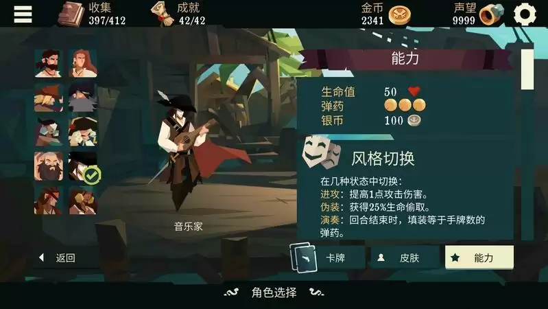 音乐家血量50,弹药3,初始牌组花里胡哨。音乐家竞技场前期依靠牌组可以打打伤害,后期这些牌可能有些污染牌组,需要移除一些。