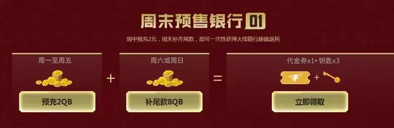 3、周末预售银行:活动期间,玩家每个周中任意一天预存2元,当周末付尾款8元(可使用7代金券)即可获得3个钥匙。