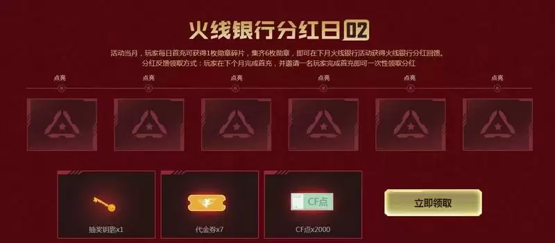 4、火线分红日:活动当月,玩家每日首充可获得1枚勋章碎片,集齐6枚勋章,即可在下月火线银行活动获得火线银行分红回馈。分红反馈领取方式:玩家在下个月完成首充,并邀请一名玩家完成首充即可一次性领取分红