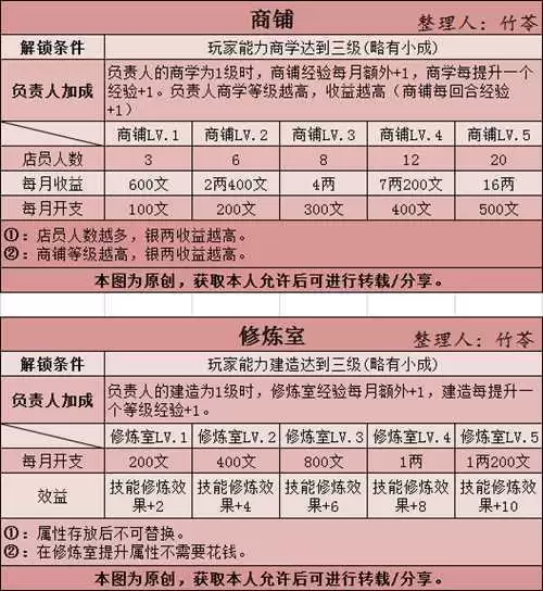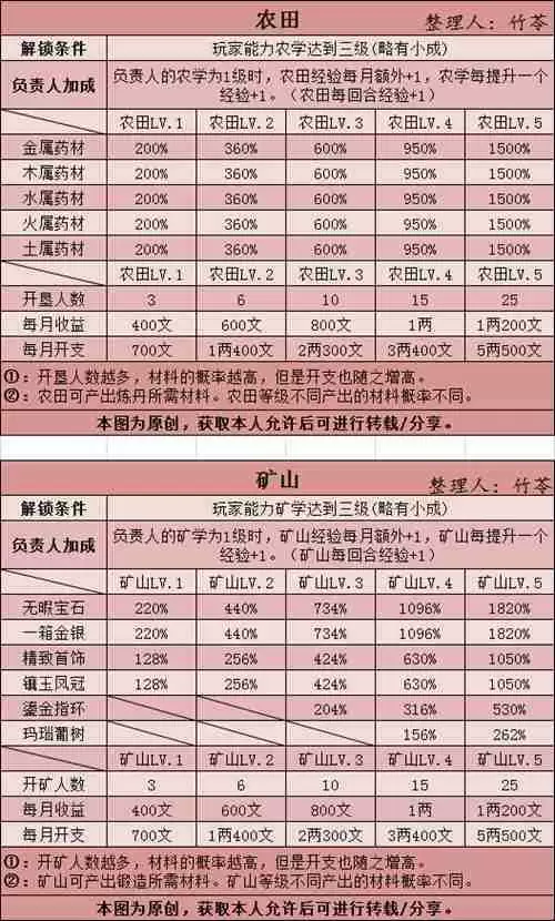 客栈打工属于极其前期的发育,矿山属于中后期发育,商铺属于后期发育。(矿山、商铺等级越高越好)