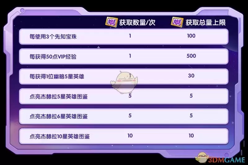 活动期间,完成图示指定任务即可获得杰赫拉的名片卡,每累积获得25张杰赫拉的名片卡,可获得一次召唤英雄的机会!
