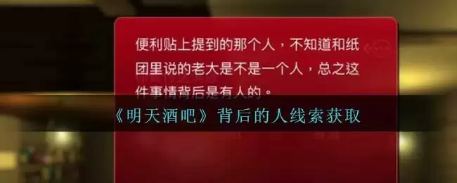 孙美琪疑案明天酒吧是一款解谜探索的冒险竞技游戏,游戏中二级线索——背后的人在哪里,怎么获得呢?下面是3DM手游网小编给大家带来的《孙美琪疑案:明天酒吧》背后的人线索获取位置介绍,还没有找到线索的小伙伴一起看看吧!