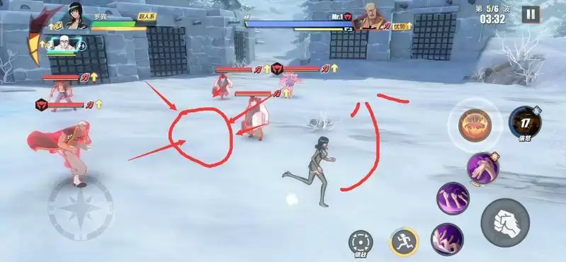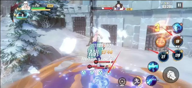 3.40时,第5波那1个治疗师和赏金猎人登场,此时我们就可以开始发动攻击。先用罗宾绕圈跑,将敌人吸引至中心区域,然后再简单打完一套(不包含奥义)技能,接着替换主战(艾尼路)登场。