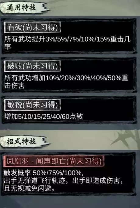 【基本暗器】行走江湖最基本的暗器手法。释放栏位: 下路特效: 连续多次出手,真气威力减少获取方法:出生自带/商城宝箱/秘境产出残页满级属性加成:4勇8敏7暗器