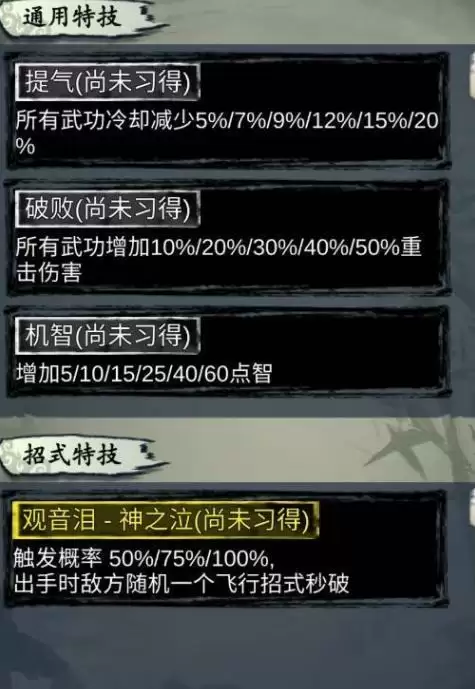 【观音泪】唐门镇派暗器,观音有泪,泪众生苦。释放栏位: 下路特效: 出手随机对面一招秒破获取方法:唐门拜师获得/商城宝箱/秘境产出残页满级属性加成:6勇8敏15暗器