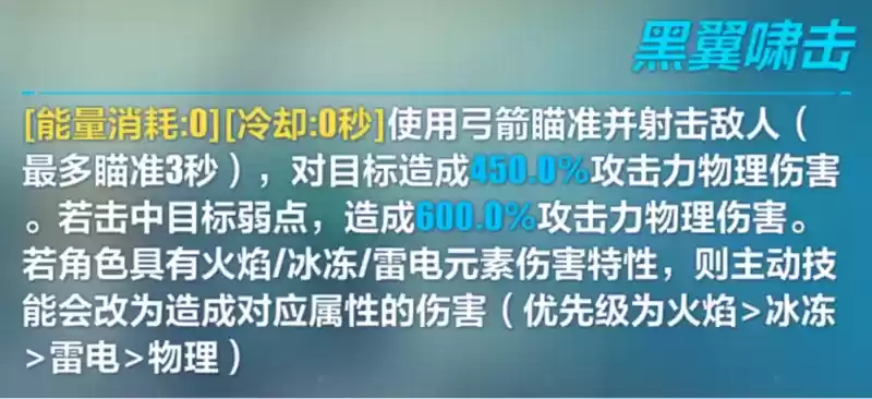 黑翼啸击:能够用弓箭对准敌人进行射击,对敌人造成百分比的物理伤害,成功攻击弱点以后能够造成百分之六百的物理伤害,角色拥有不同元素的伤害则会进行转化,该主动技能会形成玩家们对应的伤害。此技能的冷却时间达到了十秒。