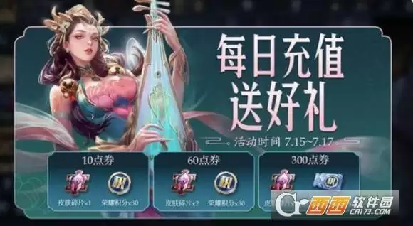 王者荣耀会不定期的推出一个每日充值的活动、活动内容如下充值10点券获得荣耀积分30+皮肤碎片1、充值60点券活动荣耀积分30+皮肤碎片1、充值300点券:皮肤碎片*3、积分夺宝券*1等等从这里可以通过充值获得一定的荣耀积分用于抽奖!个人建议充值60点券就好!相当于6元获得60荣耀积分+皮肤碎片*3+60点券(点券可以换成荣耀积分)相当于打五折抽奖!