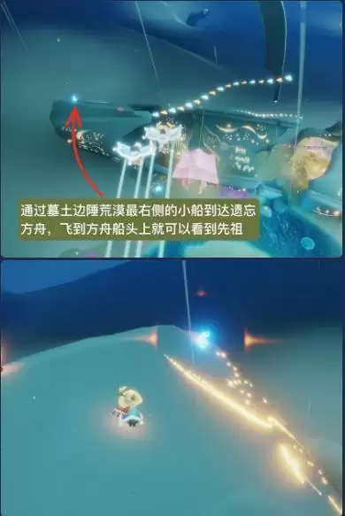 通过墓土边陲荒漠最右侧的小船到达遗忘方舟,飞到方舟船头上就可以看到先祖。