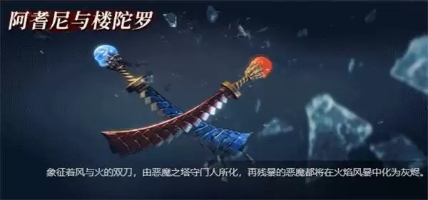 2、阿耆尼与楼陀罗:三代但丁的魔具,阿耆尼与楼陀罗是两把锋利的魔刀,集合了强大的意志与力量,它分为两把,分别是红色和蓝色。红色阿耆尼为炎属性,蓝色楼陀罗为风属性。恶魔兄弟寄宿在刀身上。
