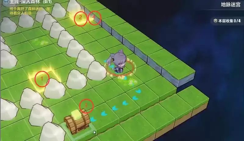 7、接上图原路返回后按顺序踩机关,即可拿到宝箱道具,迷宫内的内容我们就拿完了。