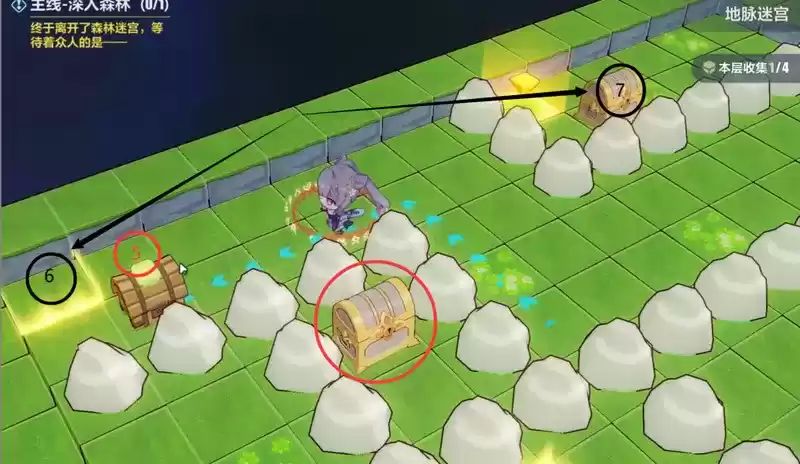 4、先看图拿到第一个宝箱,拿完宝箱后再踩2号机关出来,向地图左上角走。