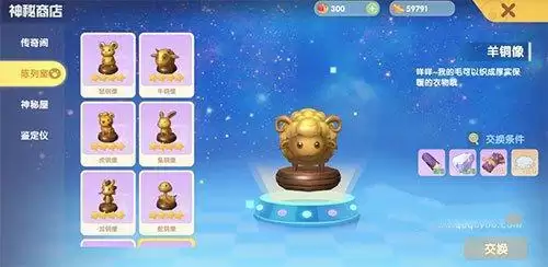 然后选择陈列室。就能来兑换十二生肖的铜像,而且还能够得到十八个罗汉的雕像,都是需要你使用这个罕见的矿石还是其他素材才能够进行兑换获取。