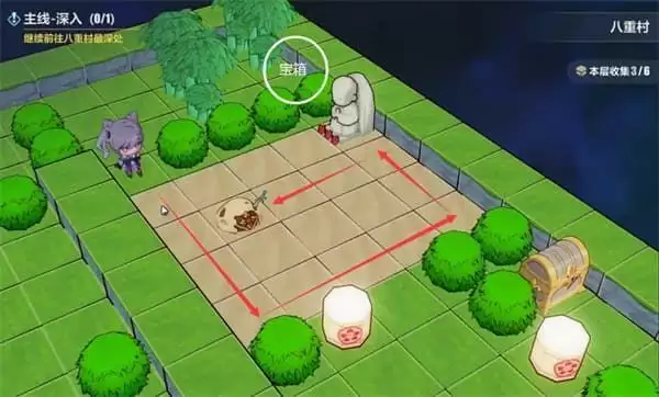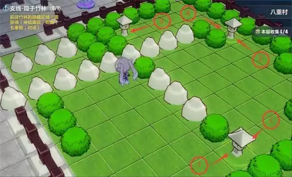 砍掉竹子可以拿一个宝箱,沿箭头走顺路和神像遗迹守卫都互动一下,神像说的话就是灯笼的互动顺序,这里直接标出来了。