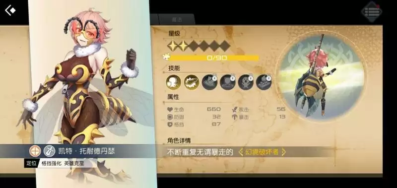 这玩意我看很多人在用,看了下被动,技能招两蜜蜂帮打,后面的被动全是PVP的,可以说打PVP还是很强的,如果想冲竞技场的可以养一个,打boss的时候也可以拿来当工具人。