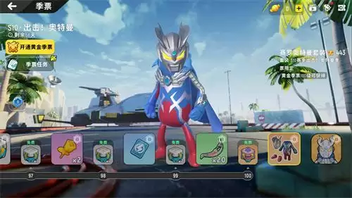 4、大家出个30块钱每周完成任务,就能很容易升级到100级的,就能获取s10赛季奥特曼主题系列皮肤了,赛罗奥特曼套装就是黄金季票100级的奖励。