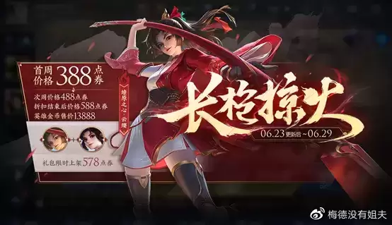 新英雄云缨上架,其价格为13888金币,她所对应的伴生皮肤-烈焰之缨也会一并上线正式服(目前唯一皮肤,可提供10点攻击力)在6月23~6月29日的活动时间内,购买云缨与伴生皮肤礼包需要578点券。