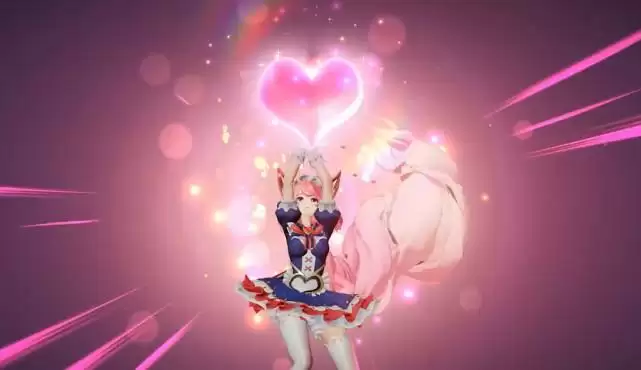 然后妲己双手交叉往上举,居然出现了一颗非常大的粉色大红心,红心上面还有彩虹出现呢,让这颗红心变得更加耀眼夺目了。