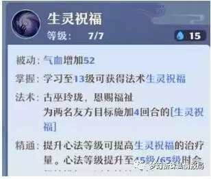 (3)生灵祝福,被动增加人物气血,南疆灵魂技能也是使用率最高的回复性技能。最新技能优化过的效果是:治疗两名友方目标,并施加生灵祝福状态。若目标已有生灵祝福状态,则本次治疗量提高。妈妈再也不用担心我重复点灯了!随着人物等级提升,最多可以给1个单位挂上持续6回合回血BUFF,但跟南疆最强仙友天玑比起来只是个妹妹,天玑是有概率同时给4个单位挂上生灵祝福