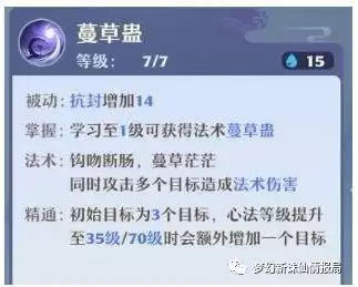 (2)蔓草蛊,被动增加人物抗封属性,这是南疆的主动伤害性法术。基本上只有PVE活动挂机的时候使用,PVP基本没有出此招的机会,最多秒5。