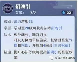 (4)招魂引,被动增加人物法力。南疆的单体复活技能,拉起队友后可以在回血的同时恢复内伤,并且施加4回合的生灵祝福,生灵祝福会在每回合初恢复一定血量。