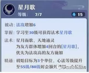 (5)星月歌,被动提高人物***,最多可以同时给5个友军增加4回合的***和法防(提升的效果在公测版本还会进一步提升),除了主目标外,优先选取***高的己方单位,这也是为何南疆能够成为法系输出绑奶的原因。在法系得到大幅提升的公测版本中,南疆会越来越受欢迎!