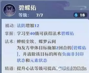 (6)碧蝶佑,被动增加人物法防,南疆最被忽略的技能。除了给单体目标加个护盾以外,还可以清除所有负面非封印状态和元素状态,这个技能在最新的改动中提高了护盾值,如果配合万毒的飞蚁护体,能够有效地保护己方万毒,对手的物理输出单位只要碰到双层护盾的己方万毒,就要被无情的反击挂毒,这也是南疆后期作为奶妈多面手的一个重要技能。