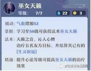 (7)巫女天籁,被动增加人物气血,南疆的大招,CD3回合,可以同时治疗包括主目标在内血量最少的5个单位(必须是存活)并结算生灵祝福,大招尽可能等己方多个单位挂上了生灵祝福后再使用,这样一次性结算可以瞬间把队友的血量抬到一个安全血限。