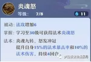 (4)炎魂怒,原来的效果是主动提升15%法术暴击+10%法伤的技能,最新的官方公告中已经改成了造成单体伤害并持续提高法爆。在使用后接大招玄火鉴,能将法术暴击最大化!