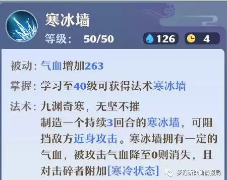 (5)寒冰墙,被动提高人物气血,持续3回合CD4回合。青云的第二个“软元素”辅助技能,为什么说是软元素呢?因为寒冰墙必须是被破坏的情况下,才会给击破它的目标施加寒冷状态(降低5%的物攻、***和速度),如果在合适的时机施放,能有效阻挡鬼王或者万毒的单体技能。
