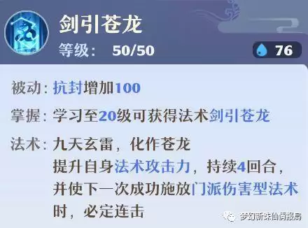 (6)剑引苍龙,青云的灵魂技能,也是对手最为忌惮的法术前置技能。被动增加抗封印属性,施放后持续4回合提升法术攻击力,并且在下一次成功施放门派伤害型技能时,必定连击!寒冰墙是不会连击的。经常作为大招的前置技能,在第二回合施放能给对手极大的压力,可以逼迫对手优先封印你,不然第三回合的全屏大招连击可够他们吃一壶的了!