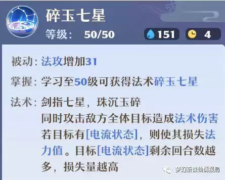 (7)碎玉七星,被动增加***,青云的大招,攻击敌方全体单位CD4回合。在使用前最好先挂上剑引苍龙BUFF,炸蓝效果在持久战中非常具有战术意义,可以有效地消耗对手的药力。