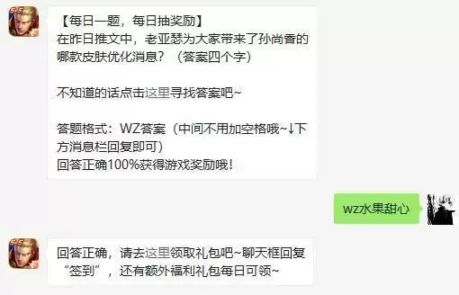 王者荣耀每日一问的问题是关于最新皮肤优化的,很多玩家不知道这个答案是什么。不清楚答案是什么的小伙伴们,其实这个答案还是很容易的,就一起来看看吧。