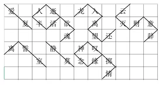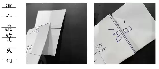 将符文中的文字分段,分段后如图所示折叠可得到四个字,也可直接从图中观察到字被分割,
