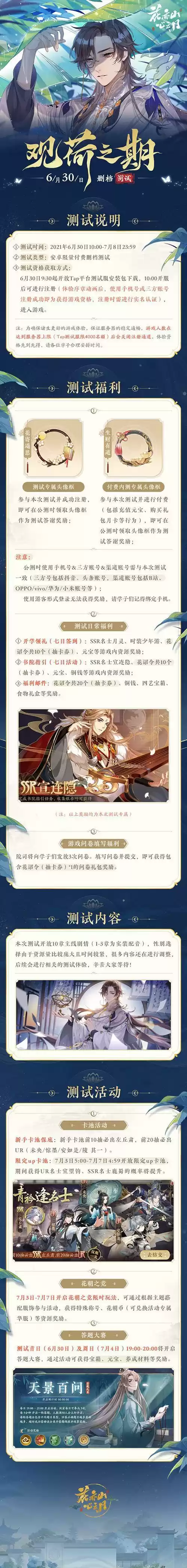 参与“观荷之期”测试的玩家,可在公测时领取【“花寄遥思”头像框】,如果在测试期间玩家进行了充值,那么在公测的时候还能领取【“生财有道”头像框】作为测试答谢,具体的测试内容大家可以看下方长图。