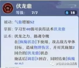 (5)伏龙鼎,被动增加人物气血,PVE中鬼王使用率最低的技能,用一位老鬼王的话说就是:狗都不用。PVP中有一定的战术意义,这个给予对手伏龙鼎的状态效果是:单体混乱对手2回合。乍一看哟呵,鬼王还是个多面手啊!使用后就结束疯魔,针对战场局势,可以和修罗怒一样控制在疯魔状态快结束时使用,高速鬼王会更适合此技能,另外就是针对对手的龟速青云或者焚香,可以在不经意之间控他一手,美滋滋!