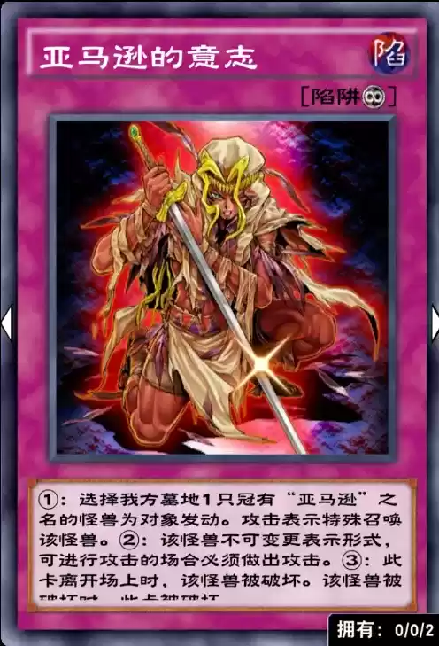 前期如果不是特别胡的情况下,亚马逊轴是这套卡组的核心战斗力,而王女也是整套卡组的重中之重。这张卡可以在排位获得百场胜利之后给到的超凡券进行兑换,虽然本月天然限一,但是依然掩盖不了这张卡的强大。这张卡召唤或者特召的时候可以稳定检索一张亚马逊的魔陷卡,在先手对局中优先检索亚马逊的意志保证场面,在后手对局中就要选择亚马逊的秘宝来保证王女的解场能力。