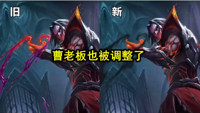 看了上面的几款女性角色的皮肤,那么再来看看这款曹老板的皮肤,这个调整起来就很简单了,把皮肤上的红色液体取消了,这种调整其实很好理解,毕竟现在王者荣耀玩家的年龄越来越低,保护一下未成年人的身心健康,在所难免嘛!