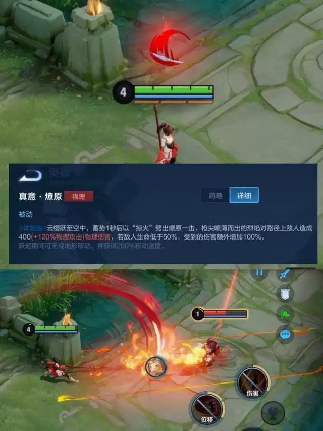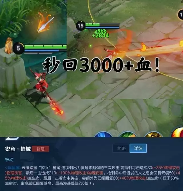 第二层被动云缨头上和手中长枪都会出现火焰标记,当按下普攻之后会连续朝敌方戳三次,当命中敌方英雄之后还会回复自身高额生命值,搭配不死鸟回复一下就能回3000血量哦!