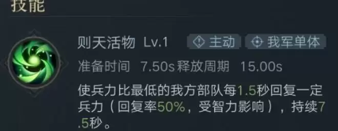 御值2御,使兵力比最低的部队每1.5秒回复一次,持续7.5秒,总计5次。间隔时长15秒。非常优秀的治疗能力,要不是这个长达15秒的间隔时间,这个恢复能力,堪比大乔。紫将的最优治疗将,并且只有2御的御值,性价比超级高,虽然还有一个2御的李典,但现在的李典,只附加吸血能力,没有治疗能力。远不如诸葛瑾。