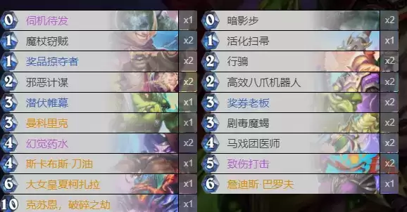 在奖券贼的起手留牌方面,主要是以伺机待发,暗影步,行骗,高效八爪机器人,奖券老板,幻觉药水,致伤打击,巴罗夫,克苏恩破碎之劫,斯卡布斯刀油,大女皇夏柯扎拉等卡为主。